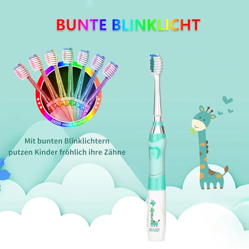 - Rend le brossage plus amusant : la première brosse à dents électrique de Seago, pour les enfants. Design du manche de la brosse à dents avec un joli motif de girafe de bande dessinée, en accord avec les préférences des enfants. La lumière LED colorée, douce et non éblouissante, rend le brossage plus facile et amusant. Grâce à la lampe LED blanche, les parents peuvent observer les dents internes et la gencive des enfants plus confortablement.